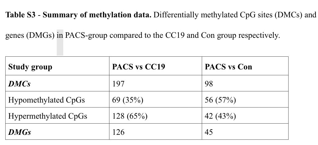 bei PACS. Die Möglichkeit, dass die PACS-spezifische epigenetische Signatur durch ein verstecktes SARS-CoV-2-Reservoir angetrieben wird, kann nicht ausgeschlossen werden. Studien, die den epigenetischen Hintergrund und die Signaturen bei anderen als dem postviralen