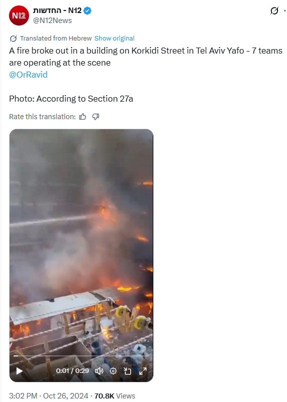 In reality, it dates back to October 2024 and shows a building on Korkidi Street in Tel Aviv engulfed in flames.