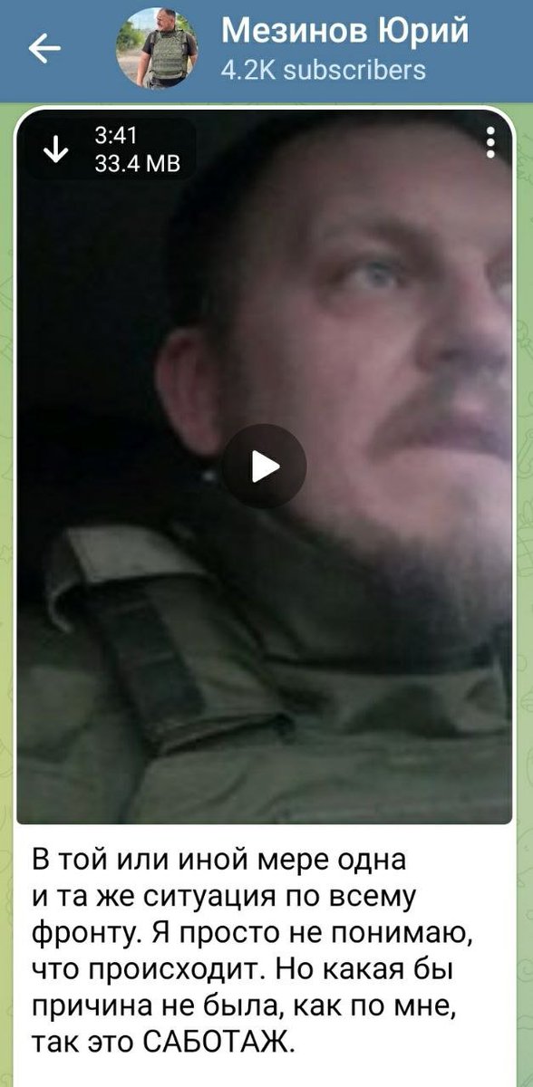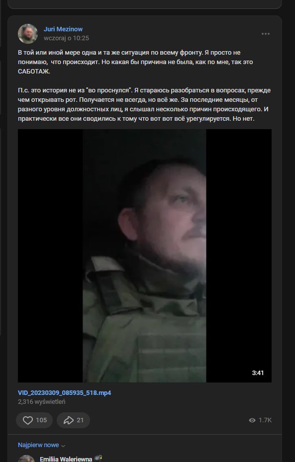 Rosyjski działacz polityczny i Z-patriota jeżdżący po froncie z humanitarką dla rosyjskich żołneirzy Mezinow Jurij nagrywa trzyminutowy filmik z wywodem na temat tego, dlaczego rosyjskiej armii na całej linii frontu kończą się pociski, przez co ginie wielu jego kolegów żołnierzy,… twitter.com/i/web/status/1…