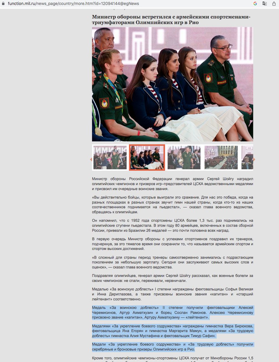 Yevgeny Plushenko is just one of thousands of the Russian top athletes who are active officers of the Russian army. Russian Army major Yelena Isinbayeva, a favorite of Shoigu, was even a torch-bearer for Olympics. Can one humiliate the Olympic spirit more?