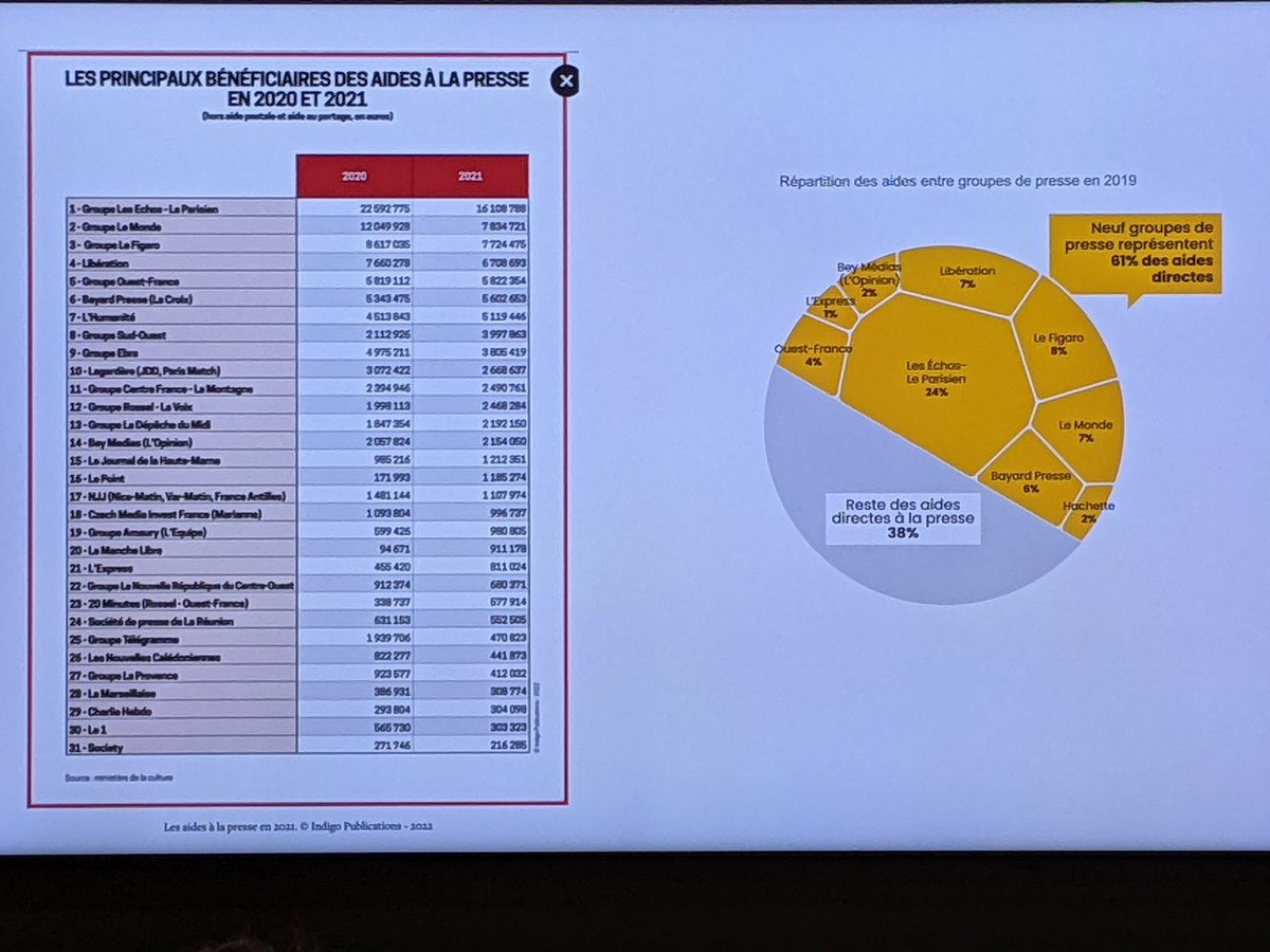L'accès aux aides à la presse est aussi un problème, dans sa répartition. Des aides à la presse négligeables sont en train d'être créées à destination de la presse numérique, défendue par le @spiil .