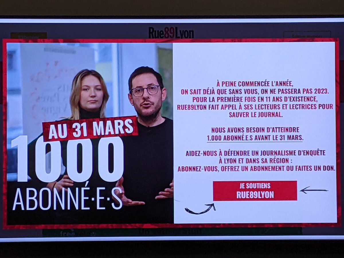 Et une mutualisation de moyens ? Si @Rue89Lyon n'arrive pas à atteindre les 1000 abonnés, il y aura des décisions à prendre. Mais quoi qu'il en soit, il y a besoin de fonds pour enquêter.