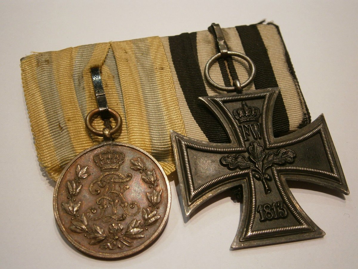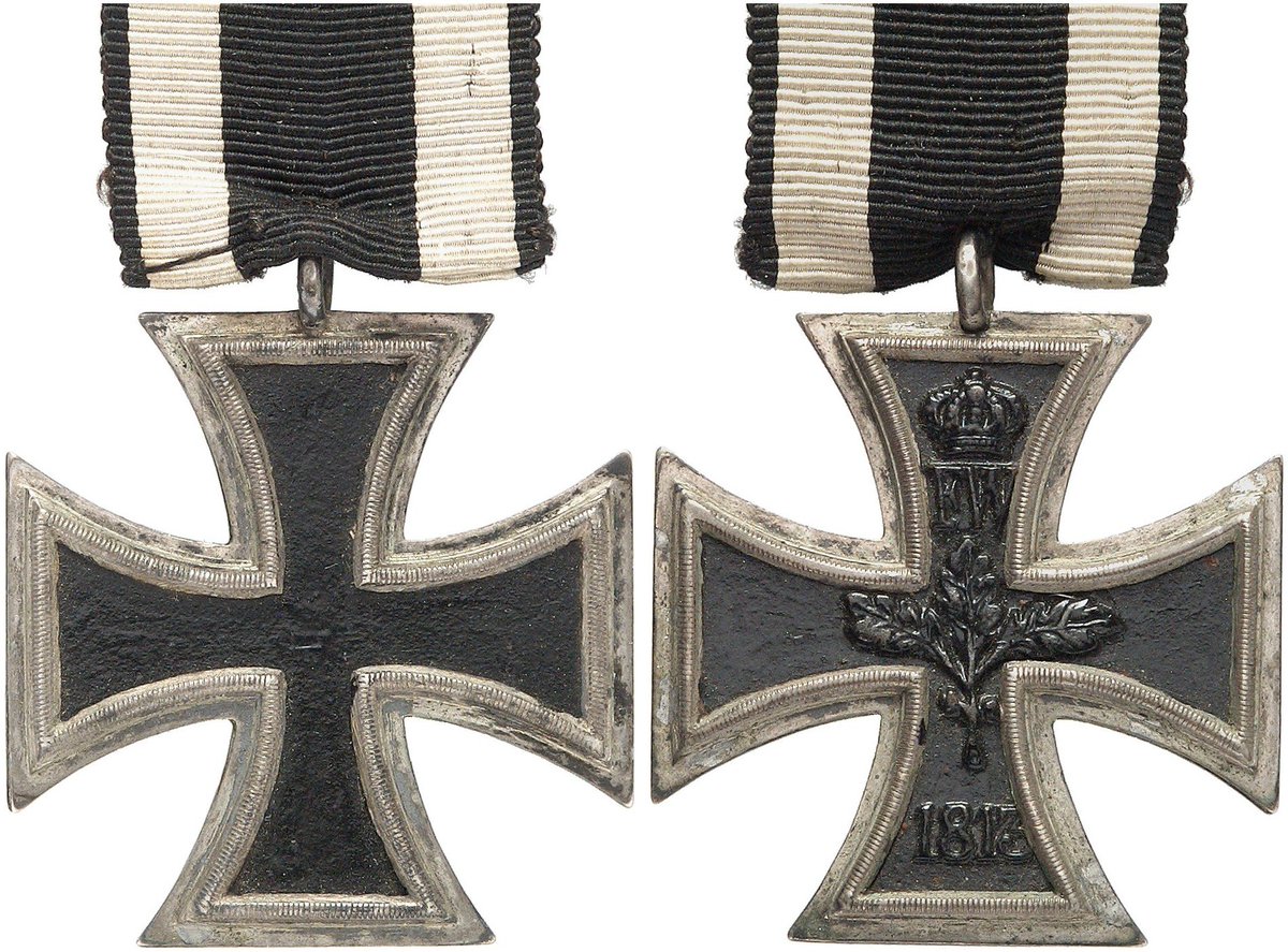 2. Both classes have the same black cross made up of cast iron framed in silver, a frontside without inscription, a backside with the name F. W. at the top...three oak leaves in the middle...and the year 1813 at the bottom.