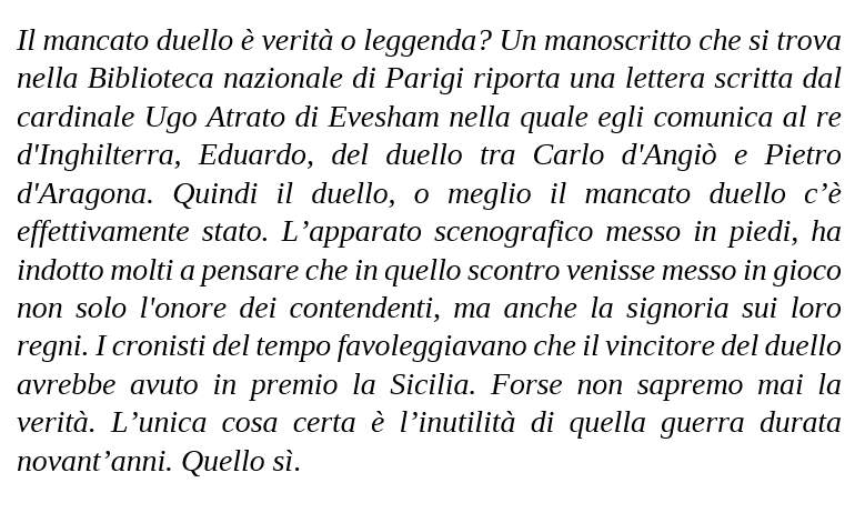Esaurite tutte le strade per riprendersi la Sicilia, Carlo d’Angiò, valoroso guerriero, escogitò un qualcosa di tipicamente medioevale per riprendersi l’isola. Sfidando a duello l’illegittimo (per lui) Pietro III d’Aragona.