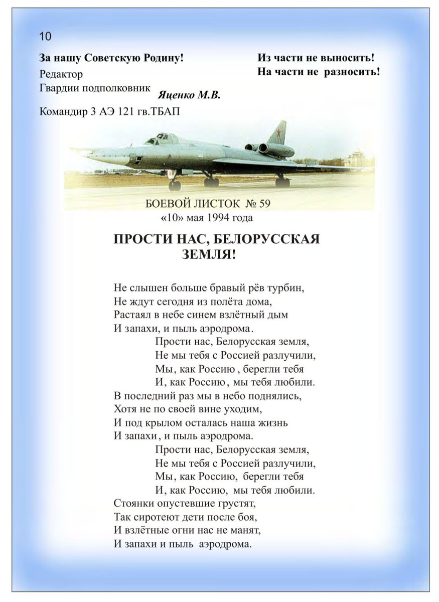 Denn: Vom 121. Schweren Garde-Bomberregiment (121 Гв ТБАП, 121 Gw TBAP), das ebenfalls in Belarus stationiert war und ebenfalls die Tu-22 flog, gibt es ein etwa zeitgleich entstandenes Video, das eindeutig dieses Gedicht zeigt.