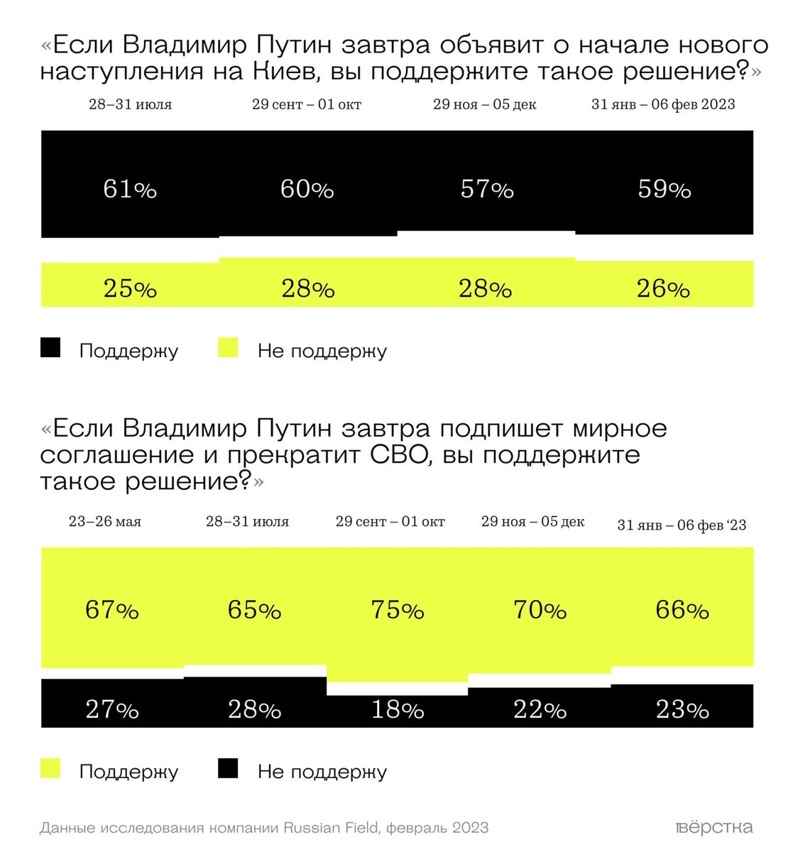 The reality is different. The key to the contradictions is this. The two questions above started with: “If Vladimir Putin were to order an offensive on Kyiv/immediate peace tomorrow, would you support it?” Russian society is fully owned and swayed at will by the regime.