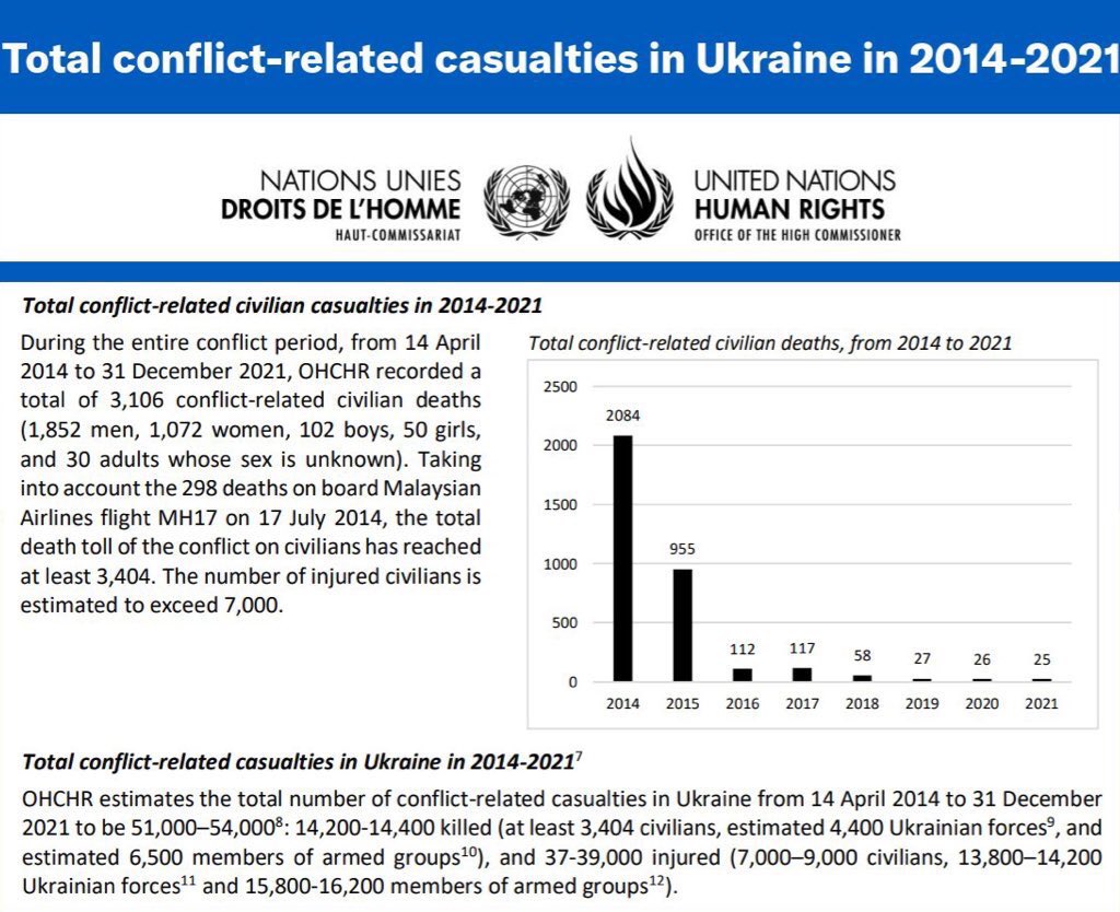 Here is the UN, which had hundreds of human monitors on the ground: 3106 civilians killed in 2014-2021 (3400 with the victims of MH17 brought down by Russia). Most occurred within a year of the mass influxes of Russian forces that started in the summer of 2014.