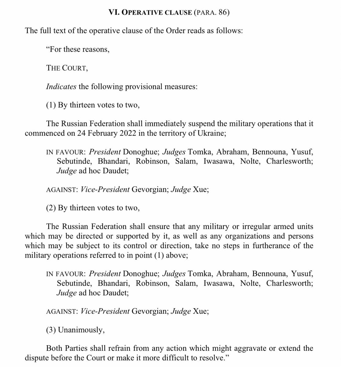 Ukraine argued the genocide allegations and the invasion predicated on them constitute a “conflict between parties” under Article IX of the 1948 Genocide Convention. Ukraine asked for the ICJ to determine that the allegations are false and to order the withdrawal of the invaders.