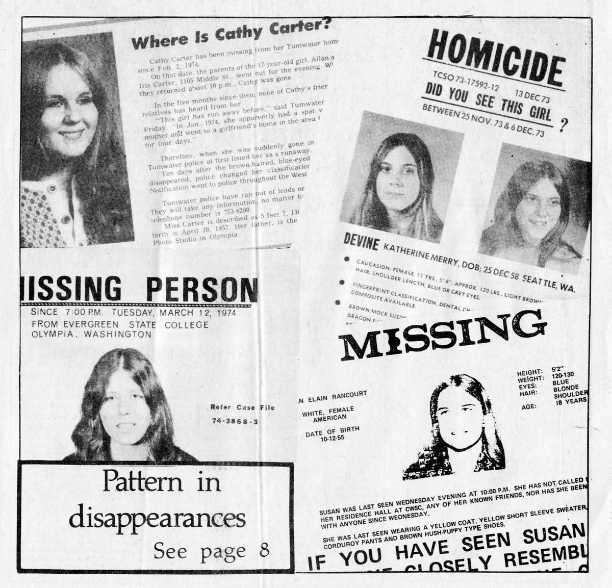 La gente que presenció esto, pudieron ofrecer una una vaga descripción física de Ted, de su “modus operandi” y de su coche. Es entonces cuando esta información empieza a ocupar todos los noticiarios de Seatle, su nombre, su coche y su retrato robot.
