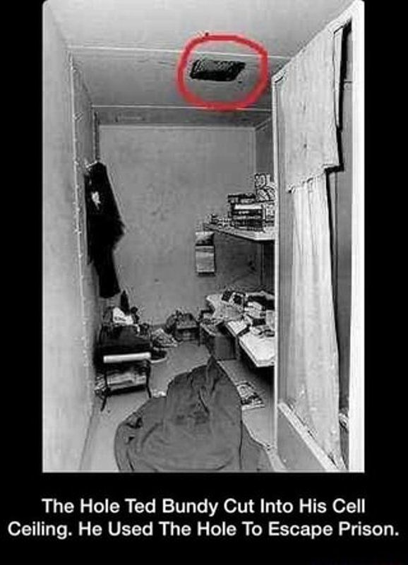 Ted adelgazó más de 15kgs para lograr meterse por el conducto de ventilación de su celda que terminaba en el vestuario donde consiguió cambiarse el uniforme y salir por la puerta delantera. Esta vez estuvo prófugo varios meses y descargó su ira asesina!!