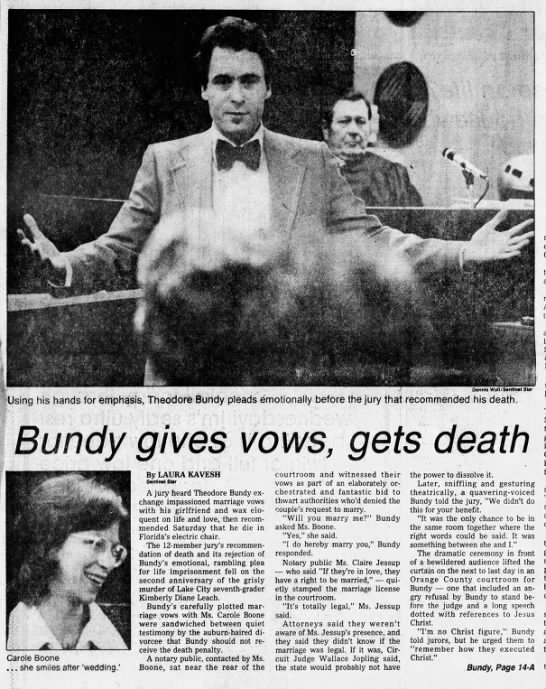 Pero nada de esto le sirvió a Ted para escapar de la condena. Fue declarado culpable y le cayeron 2 penas de muerte por los asesinatos de Lisa Levy y Margaret Bowman. Posteriormente fue juzgado por la muerte de Kimberly Leach y sumó otra pena de muerte más.