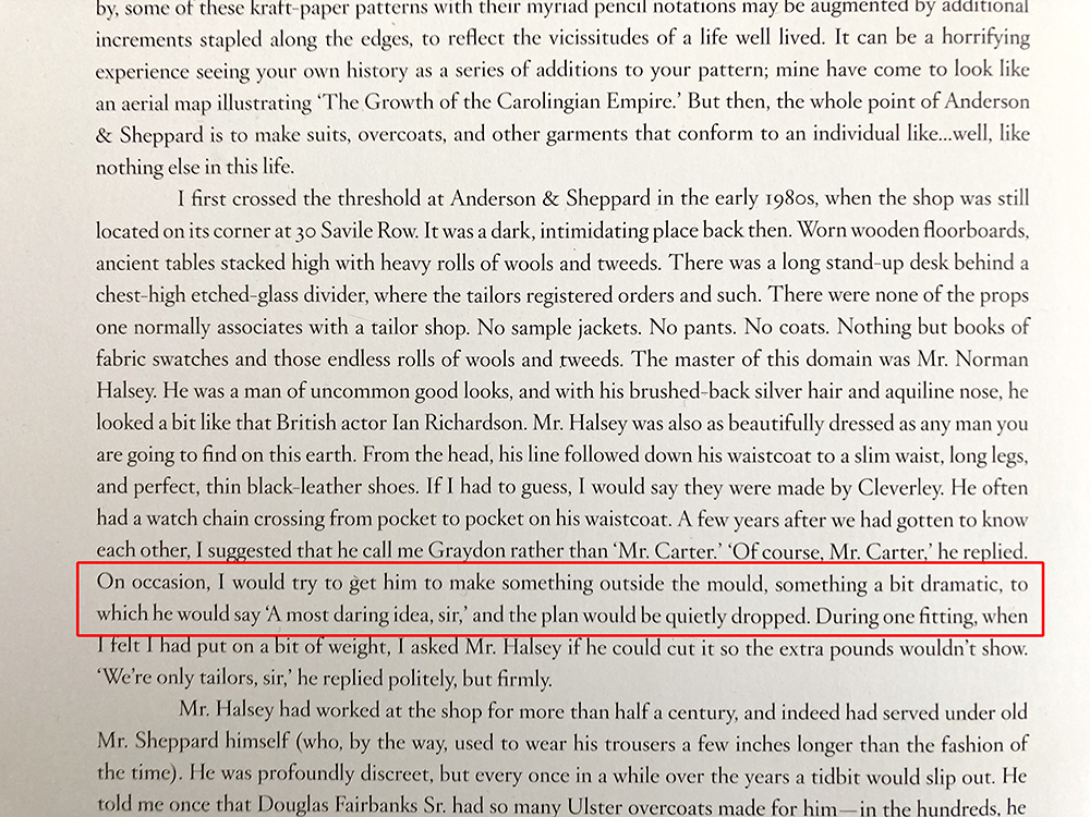 in Anderson & Sheppard's vanity book A Style is Born, Graydon Carter wrote about how his fitter would quietly drop the subject if he brought a suggestion that was in bad taste. "a most daring idea, sir." and that would be the end of it.