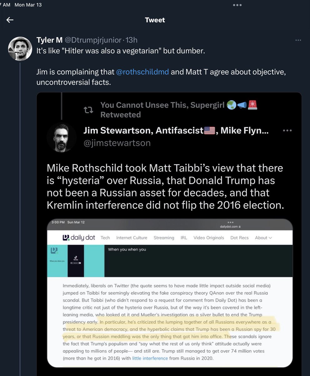 This attack was retribution because I wrote a factual thread on an article by Mike Rothschild raging at liberals and “BlueAnon” which extensively quoted Kremlin propagandist Matt Taibbi.
