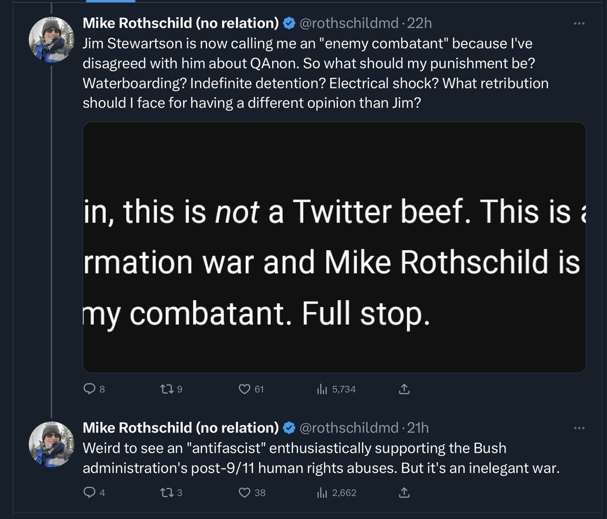 Mike Rothschild has responded to this thread in typical fashion. He demands more proof and accuses me of wanting to waterboard him despite the fact that it says “information war” right in the same sentence.