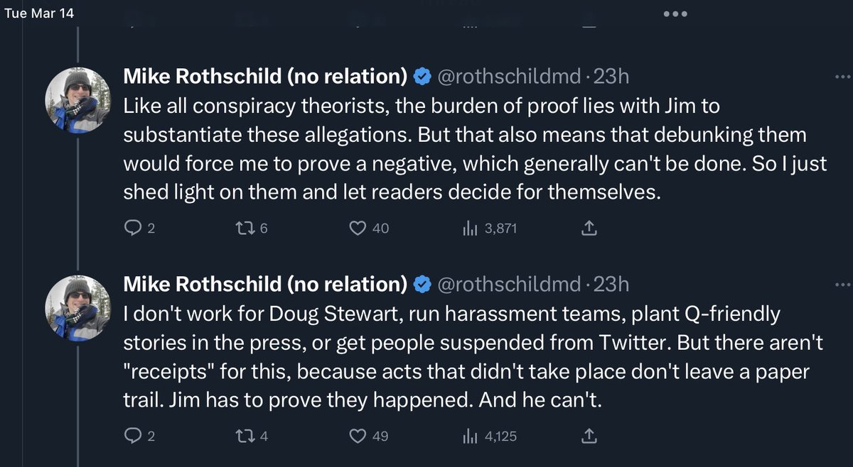 Here is Mike Rothschild’s best friend on Twitter, according to his own replies. This guy literally has nothing else to do other than attack me with disingenuous Twitter threads.