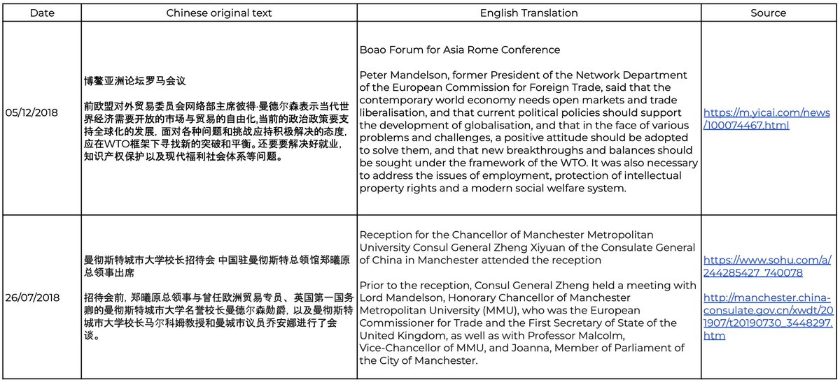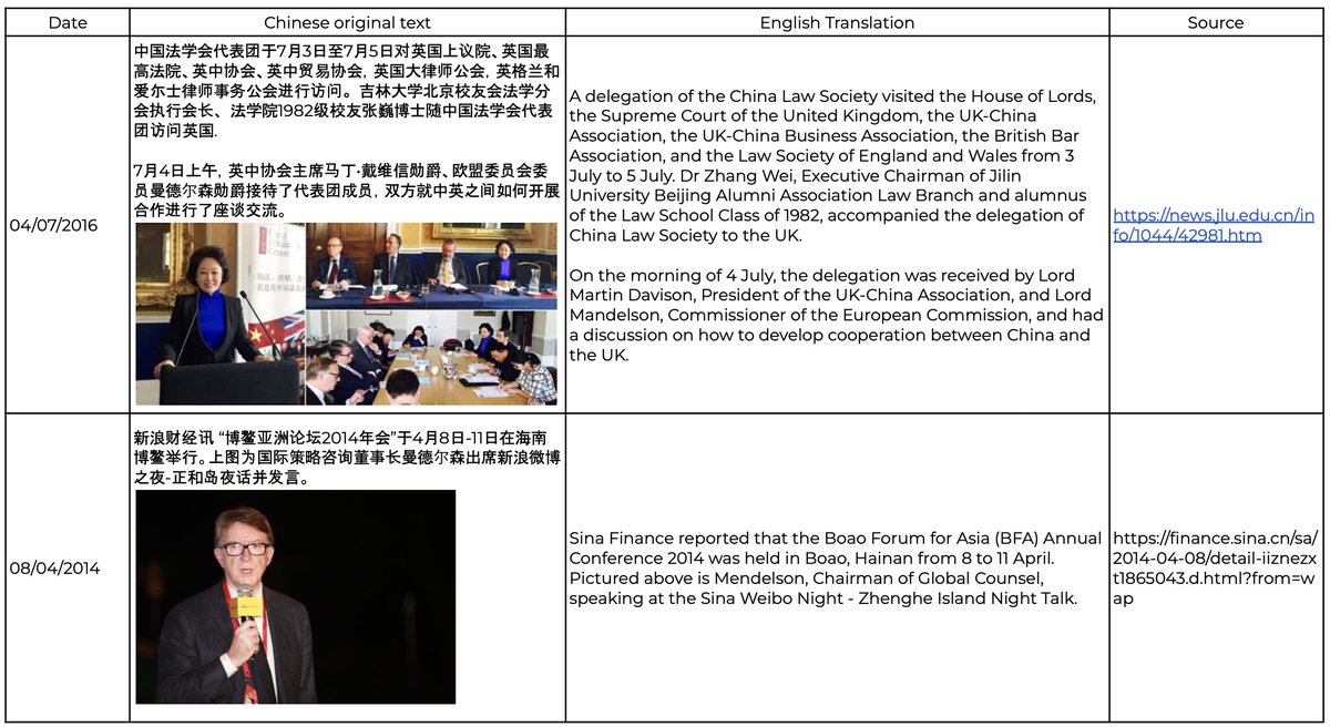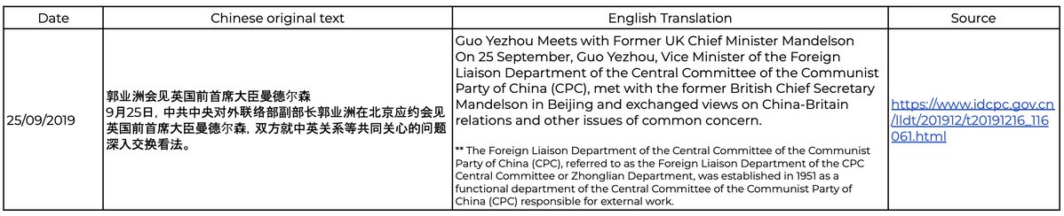Mandelson maintains regular contact with united front linked organisations and others that serve the Chinese state's strategic agenda, including: