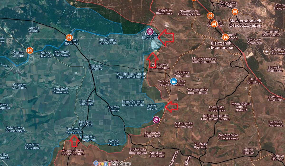 Kreminna i Spirne. Tutaj również nic nadzwyczajnego się nie wydarzyło. Dobra informacja to to, że nie ma żadnych potwierdzonych wiadomości o utracie przez siły UA pozycji w tym regionie. 2/