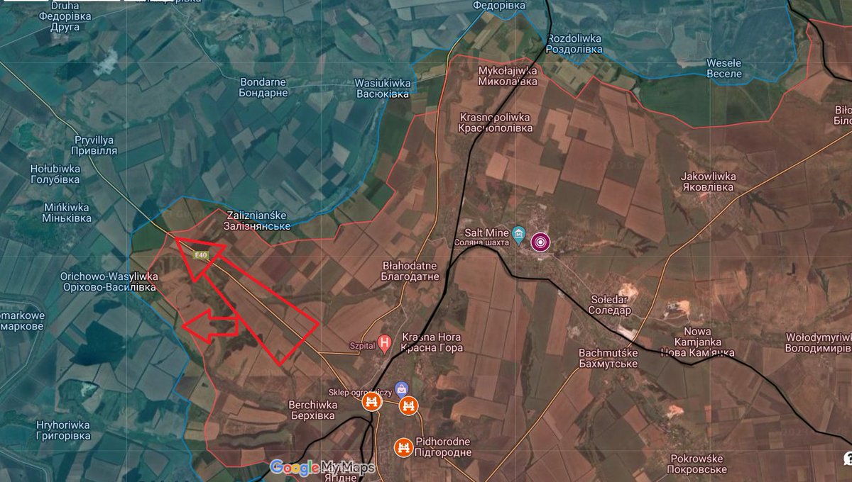 Północ Bachmutu. Zadziało się tutaj źle dla UA w ciągu ostatnich kilku dni. RUS wyprowadzili silne ataki wzdłuż drogi M03 i zyskali kilka kilometrów ziemi. RUS przez chwile doszli, aż do wsi Minkiwk, zajęli część wsi Zaliznanskie i Orichowo Wasyliwka. Trwają ciężkie walki. 5/