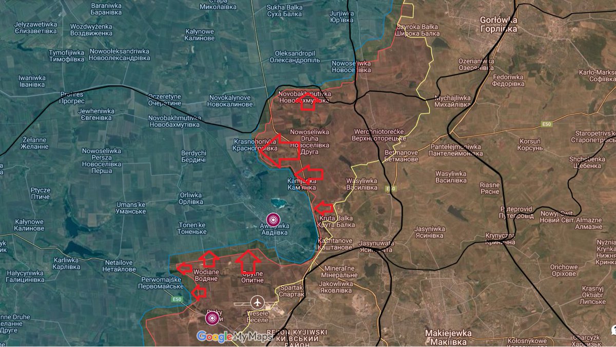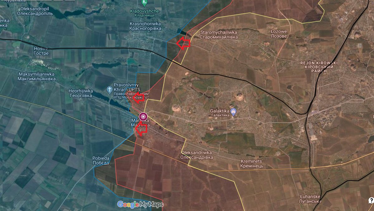 Marjinka - tutaj również nie mam dobrych informacji. Niestety, RUS bardzo dużym kosztem zajmują metr za metrem pozycji obronnych UA. Oczywiście, natarcie osiąga sukcesy na poziomie 10 metrów na dzień, ale jednak Ukraińcy tracą teren i ludzi. 11/