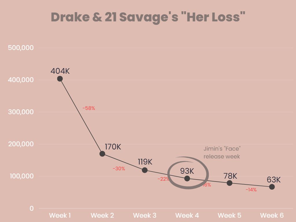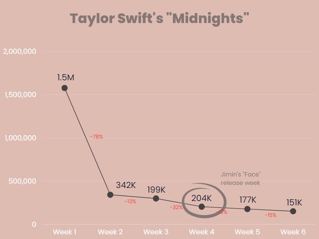 As you can see, both artists experienced a significant drop in sales after the first week (the more sales u debut with, the steeper the drop, which is why TS had a steeper drop from the mega debut number of 1.5M). After W1, the sales trend downward until...