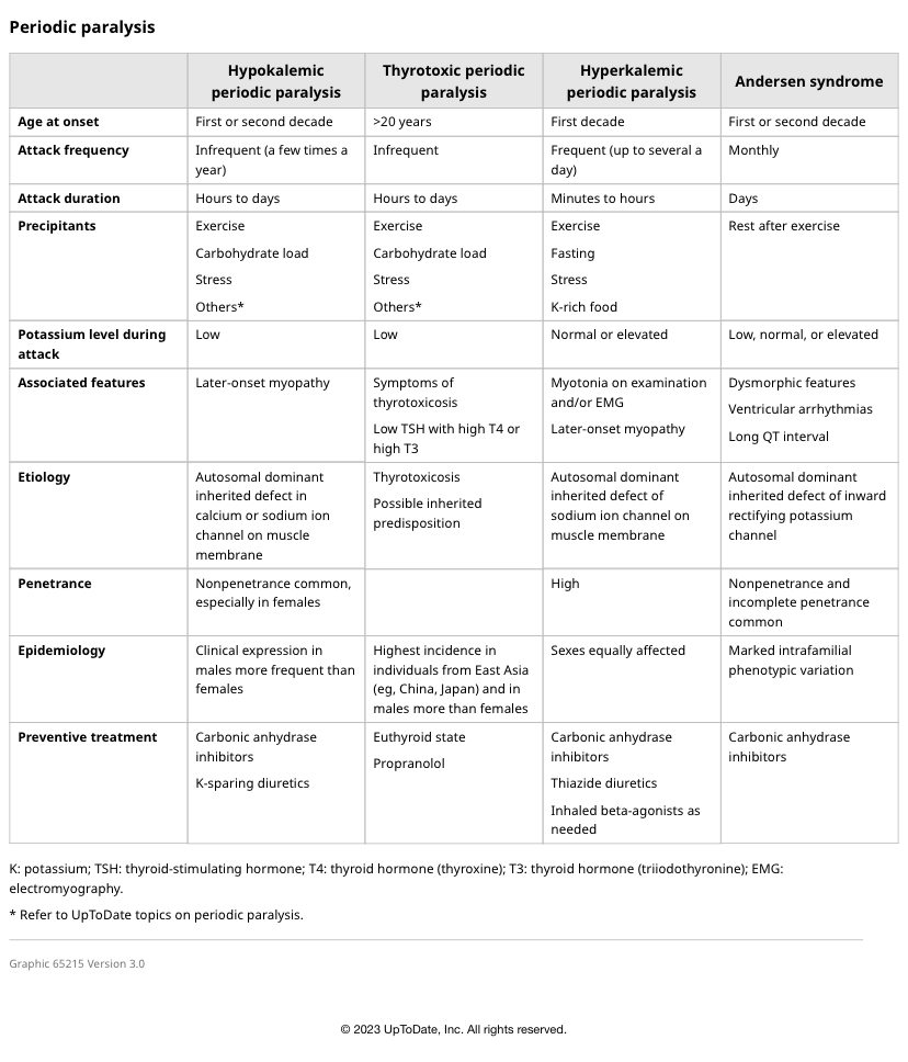 Theseinclude : 1. Hypokalemic Periodic Paralysis (Calcium Channel) 2. Hyperkalemic Periodic Paralysis (Sodium Channel) 3. Anderson Tawil Syndrome (Potassium Channel) 4. Thyrotoxic Periodic Paralysis (Potassium Channel) (most common in India)