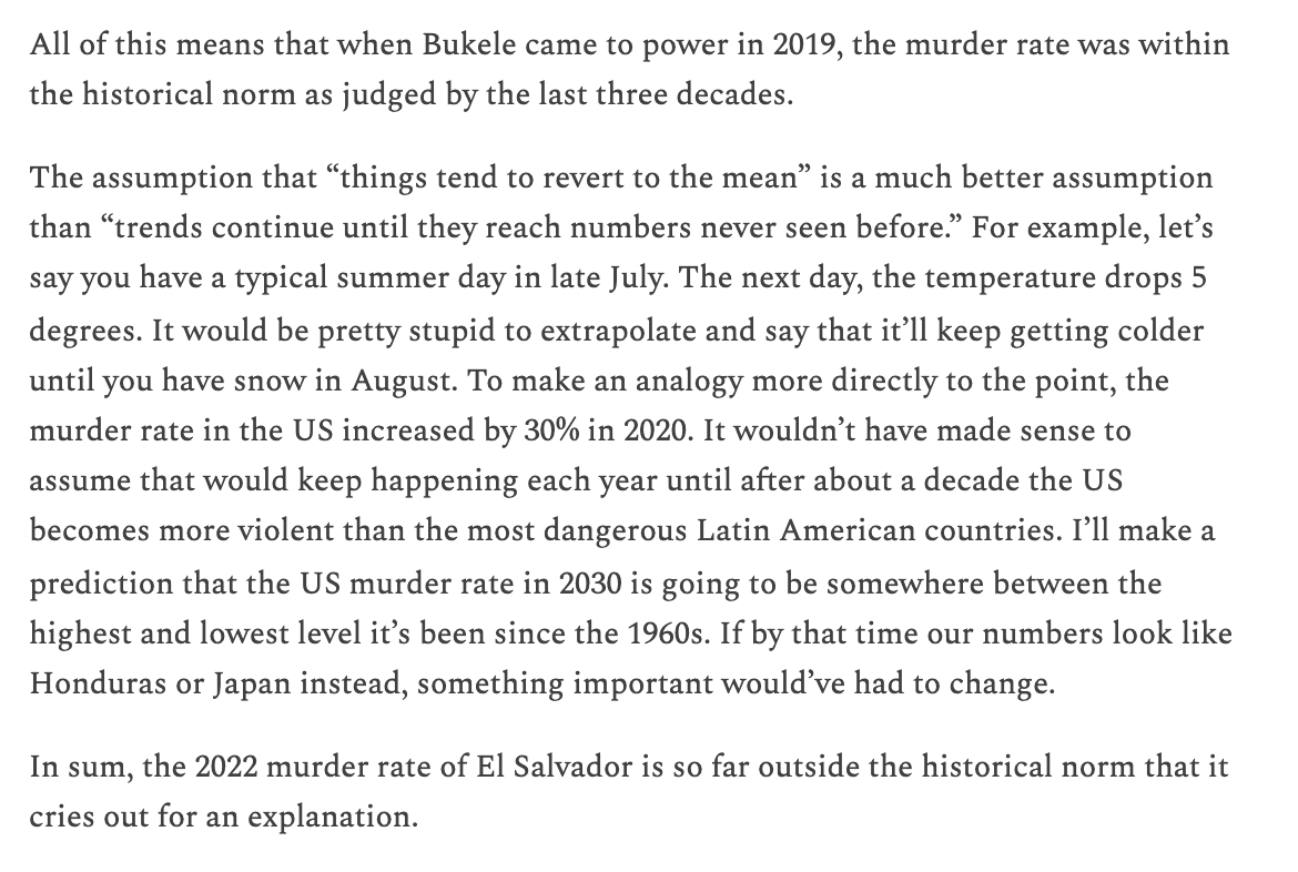 Was the crackdown by @nayibbukele really responsible for the drop in crime in El Salvador? Some argue the murder rate was already falling, or the decline can be attributed to a deal between the gangs and the government. But these arguments make no sense.🧵 richardhanania.substack.com/p/the-midwit-m…