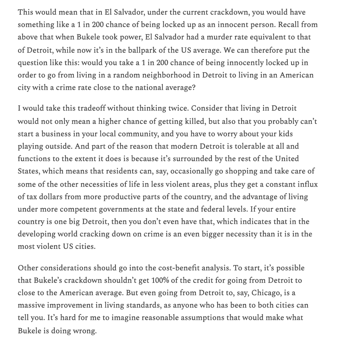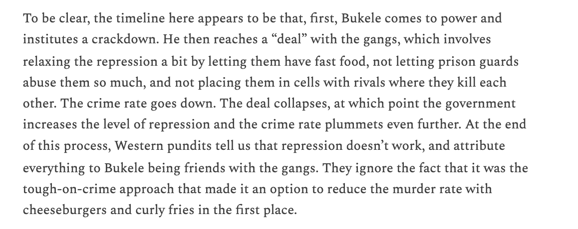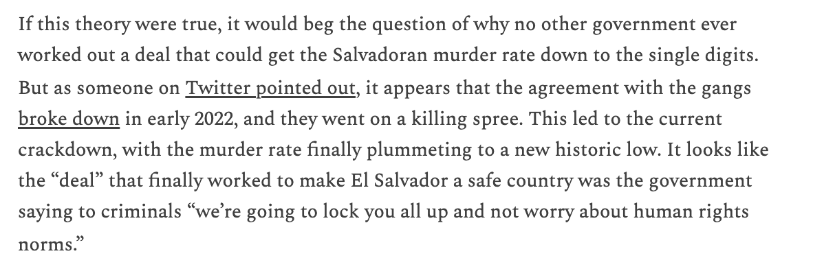 Notably, no one disagreed with my back-of-the-envelope calculation showing that if we assume the Bukele crackdown did influence the crime rate as it appeared to, it would be justified. This is what makes people need to deny the repression worked. But I think it clearly did.