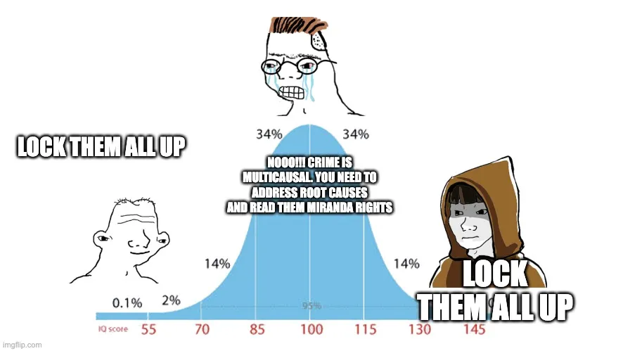 This is like the Platonic ideal of the midwit meme. Bad people do bad things. Lock them up, they stop doing them. To much of the intelligentsia, this seems quite puzzling.