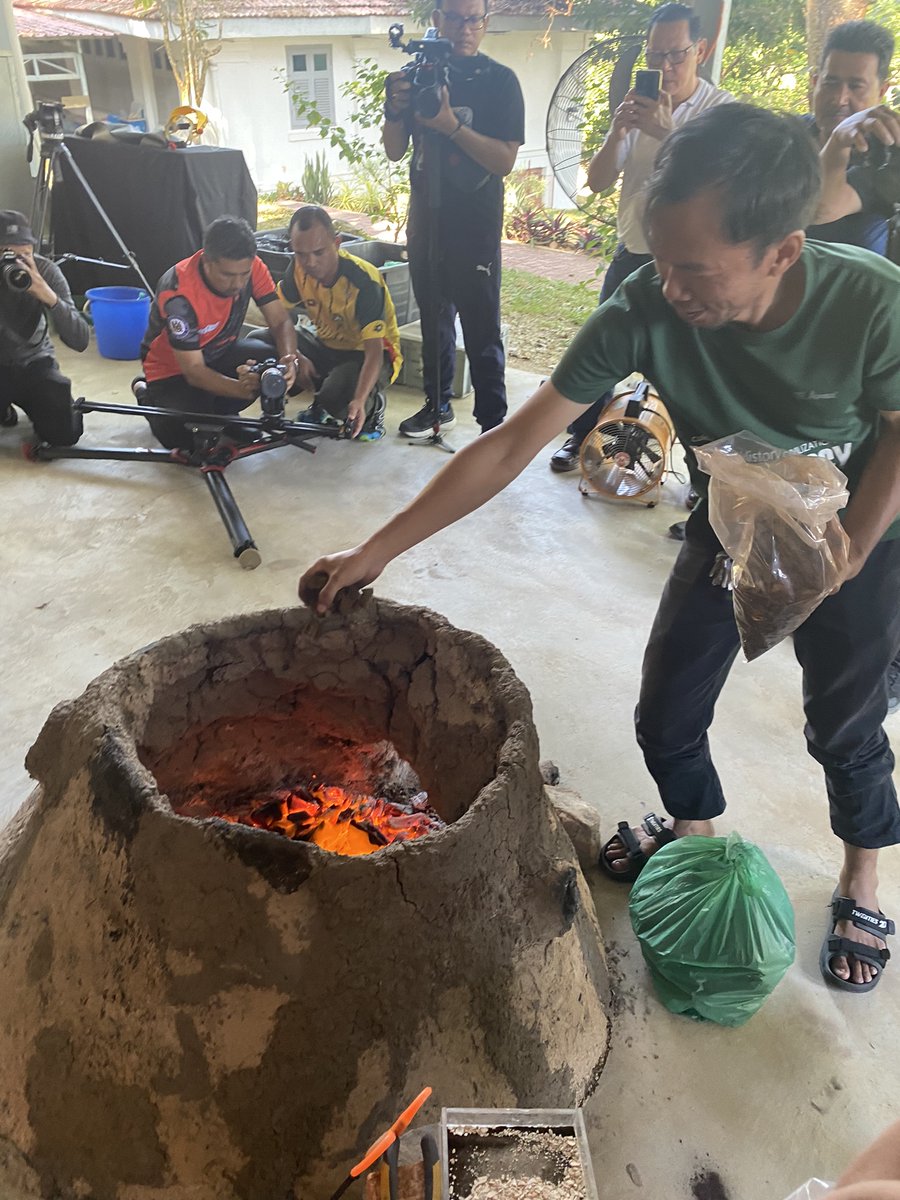 Lepas dah hancur jadi halus, batu batu tu dituang dalam relau tanah liat dengan kayu bakau sebagai sumber api. Kayu bakau digunakan sebab dia boleh bakar dengan lama dan sumber dia banyak di sekitar paya muara Merbok dan Sungai Batu.