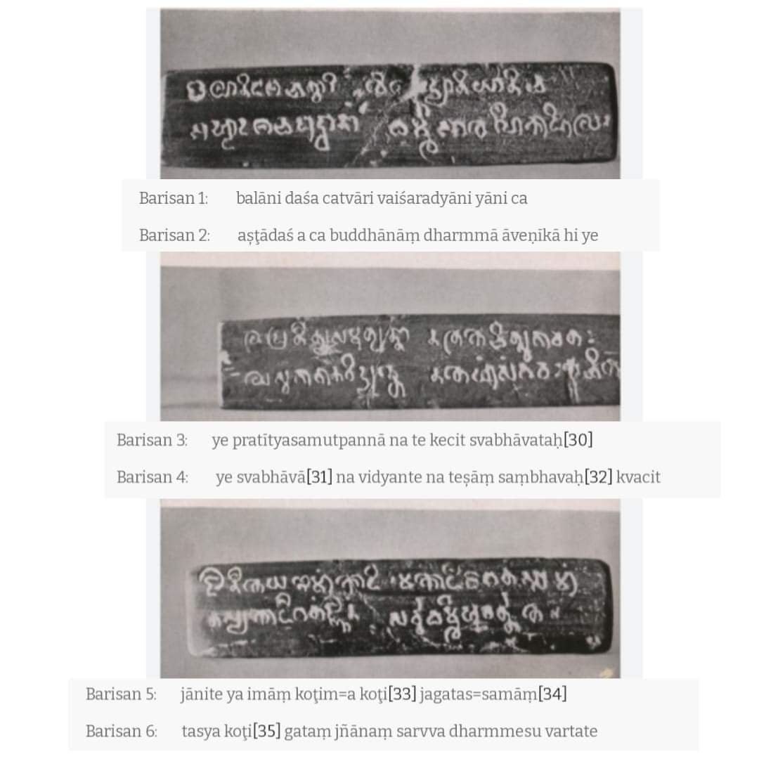 -dan arkeologis situ rasa sangsi. Bila dikorek lagi candi ni, jumpa batu bersurat mantera dengan skrip Pallava. Macam Jawi yang berevolusi dari takde huruf ‘ga’ dan ‘nya’, sama jugak dengan Pallava.