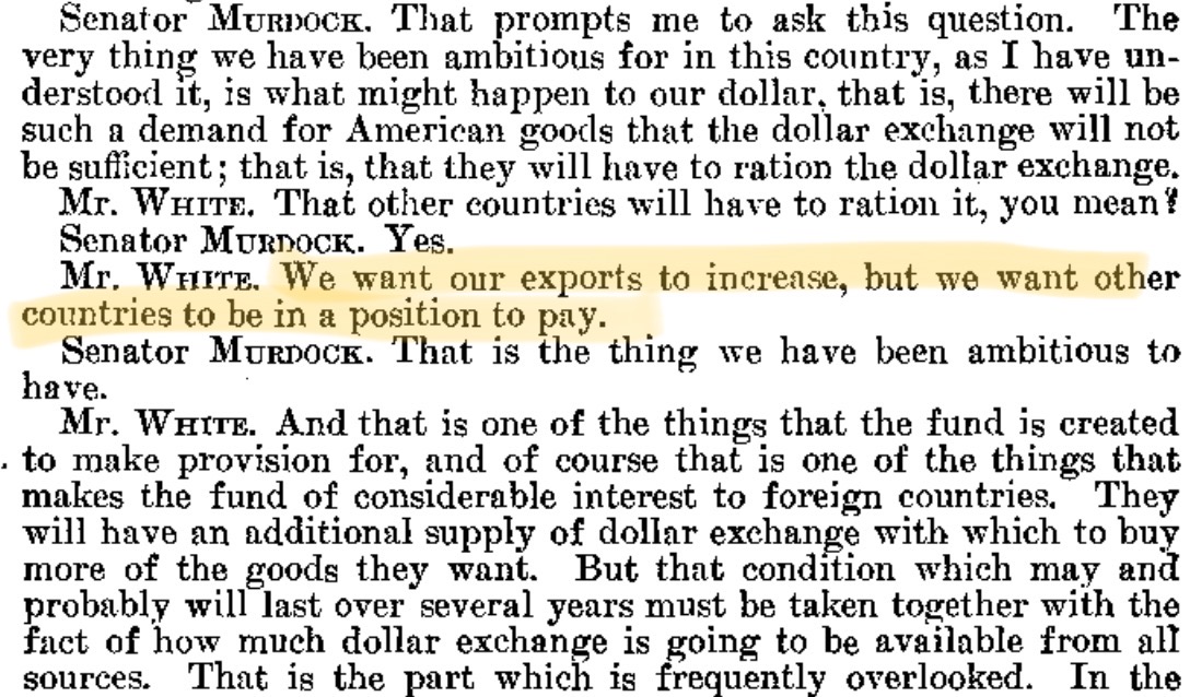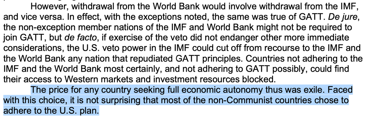 To address this, the US created the IMF and World Bank, and through their unilateral veto power, began dismantling old colonial spheres of influence, particularly the British empire, simultaneously preventing the remilitarization of Europe, and clearing the way for US exports.