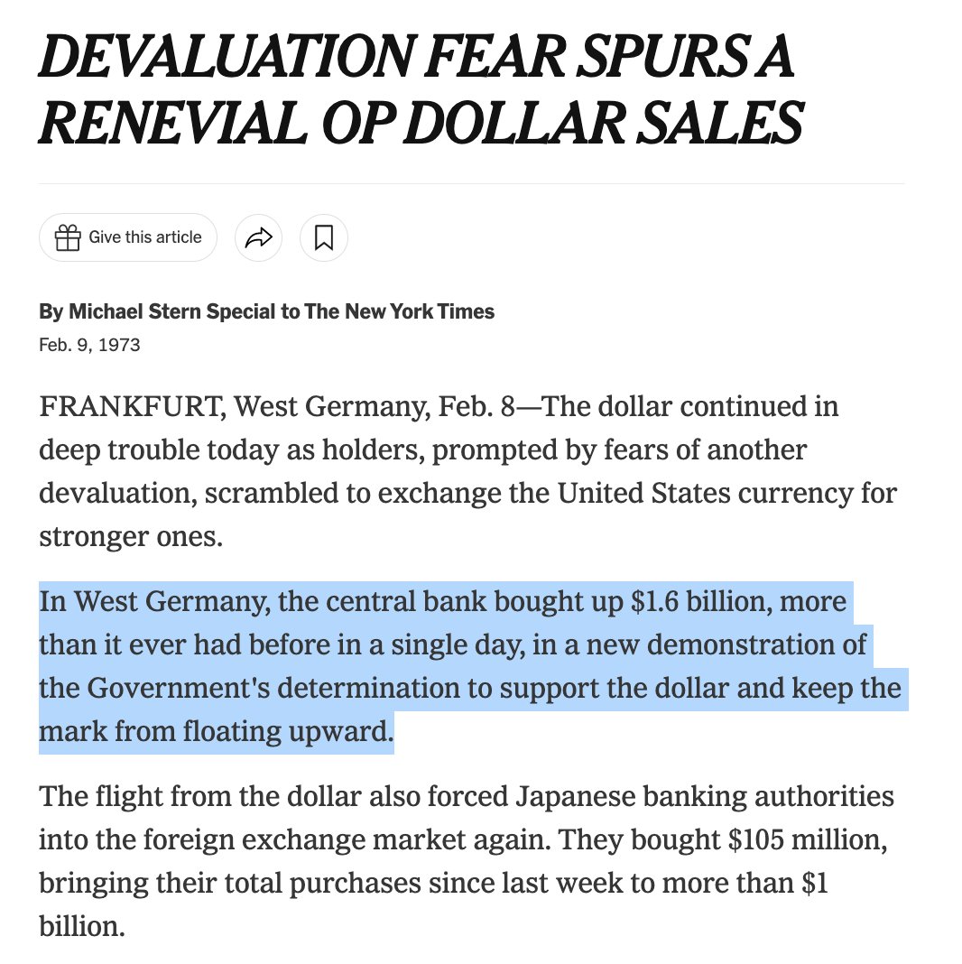 When this ballooning trade deficit caused gold to begin flowing back to Europe, the US broke the dollar-gold link in ’71. At the time, no country was willing to call the US’s financial bluff, since crashing the dollar would have devastated the export industry in surplus countries