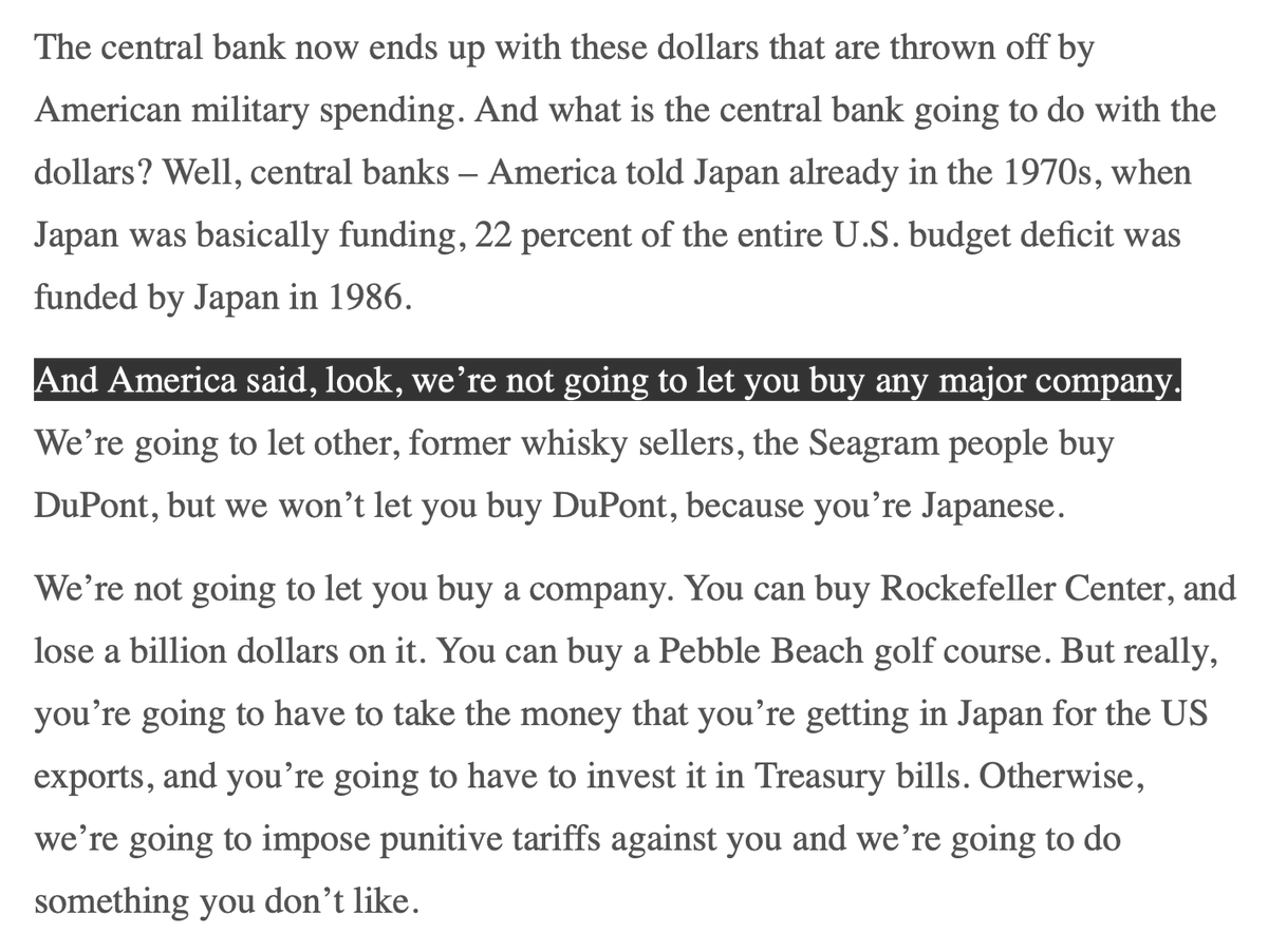 This left co-imperial vassal states like Japan, Germany, and the UK only one option: to recycle their excess dollars back into the US to buy Treasury securities—impotent financial IOUs that would never yield any meaningful leverage over American enterprise.