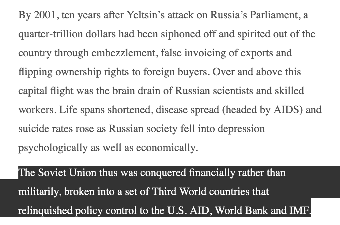 Through dollar supremacy, the financial class has been freed from having to balance trade flows or budgetary deficits and can instead pour money into non-productive rent-seeking endeavors like the privatization of public industry, real-estate monopolies, and the stock market.