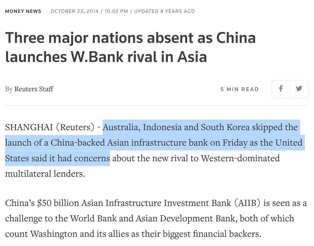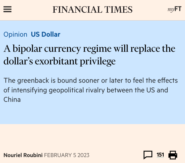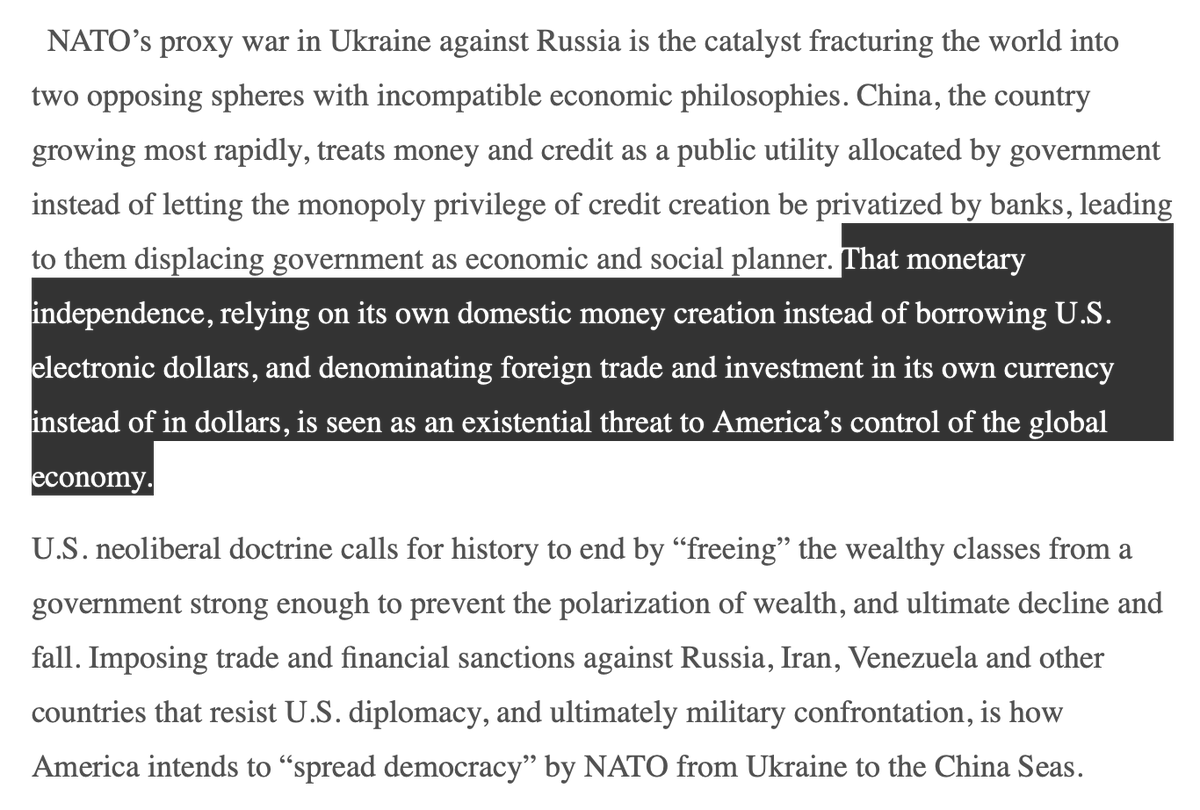 This is why the rise of China is an existential threat to the US. Not because China has goals to militarily dominate the world, export their ideology, or subsume all competition, but because the US *does* and China represents the first viable alternative to US financial monopoly.