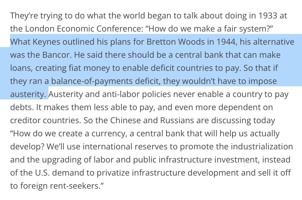 Ironically enough, the world seems to have arrived back at the Bancor system, proposed by John Maynard Keynes at Bretton Woods in 194 as a supranational currency system not under the control of any one country. Instead, the dollar won out, leading to 80 years of dollar hegemony.