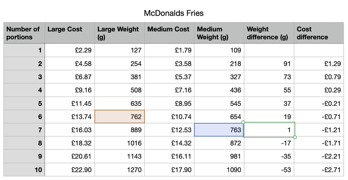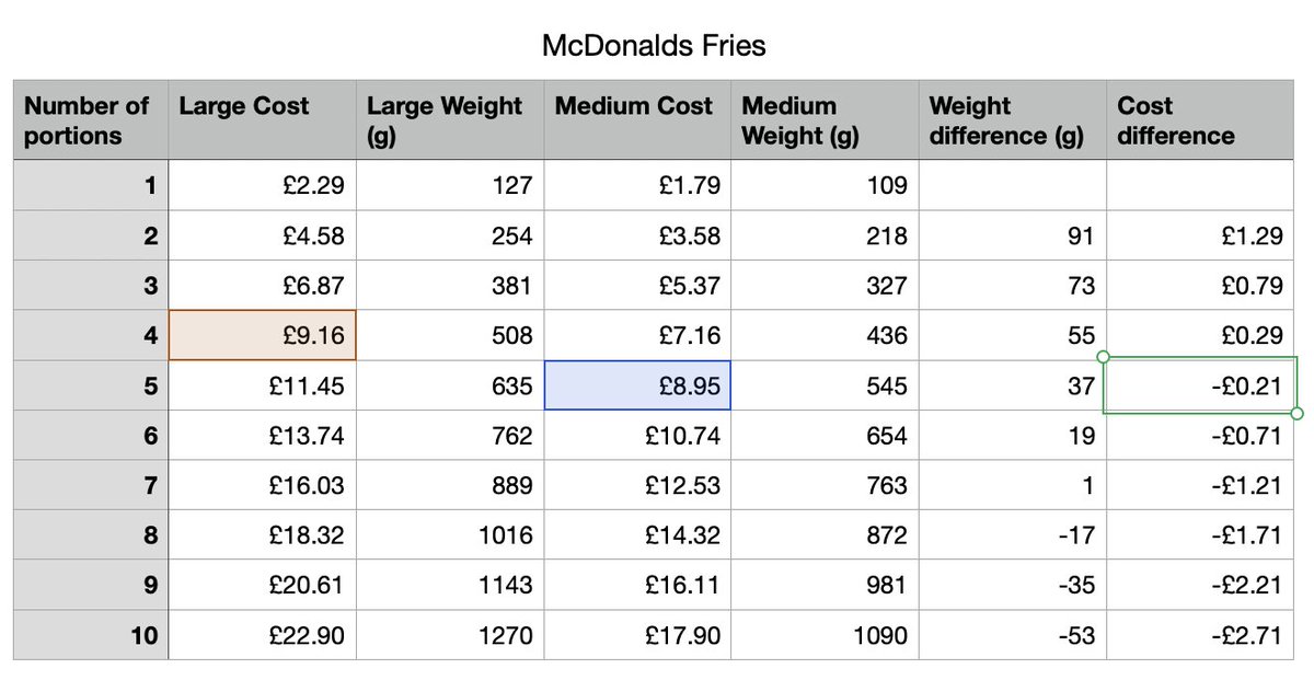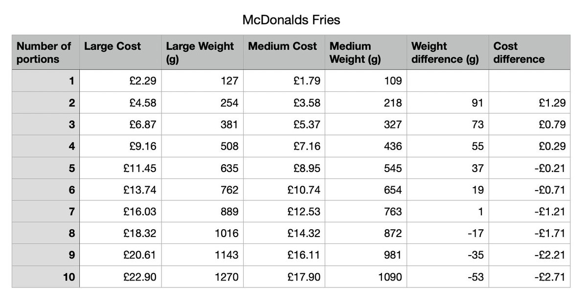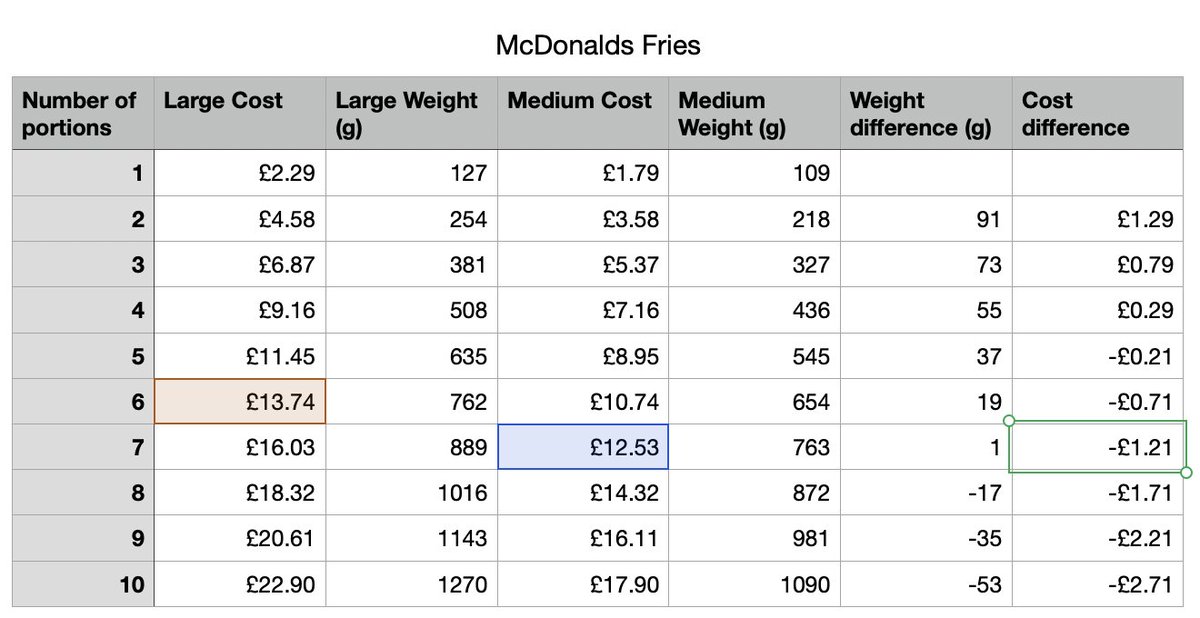 This works up to 7 mediums vs 6 large where you get 1 gram extra of fries for £1.21 less! After that, it gets cheaper but you do get fewer fries.