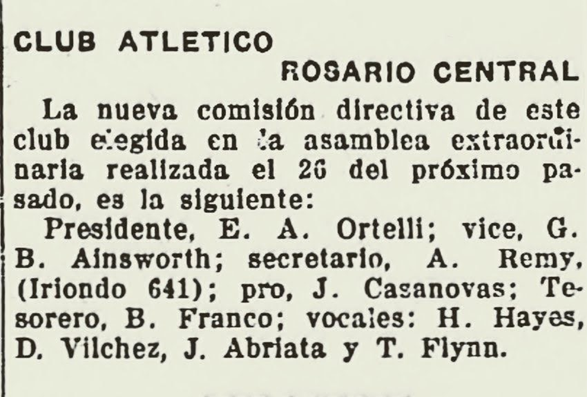 Hoy hace exactos 100 años se realizó una asamblea de socios de ROSARIO CENTRAL que sirvió para aprobar la memoria y balance (MyB) del año anterior.