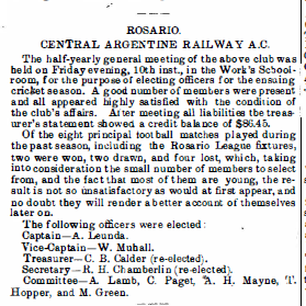 La reunión general semestral del club mencionado se llevó a cabo el viernes 10 por la noche, en el salón de la Escuela del Taller de ferrocarriles, con el propósito de elegir a los miembros para la siguiente temporada de cricket..." ➡️