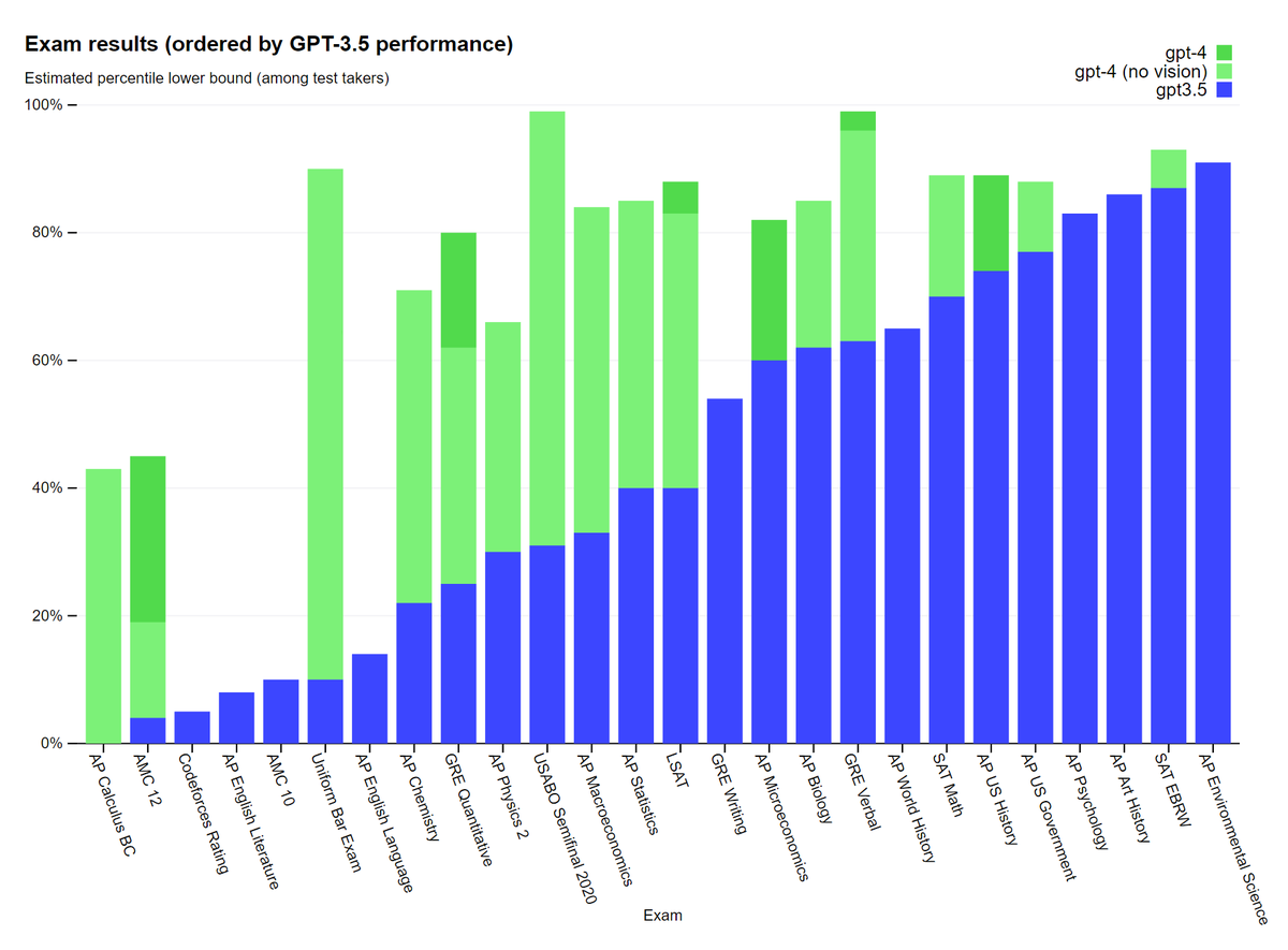 π€The GPT-4 has performed comparable to humans in a variety of professional and study tests. For example, it passed the bar exam, placing in the top 10% of test takers.