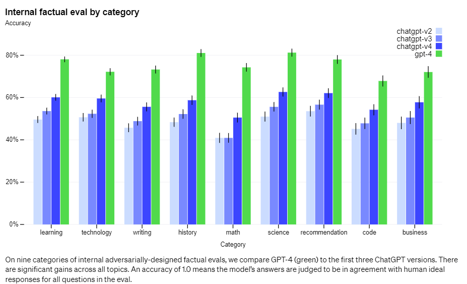 The GPT-4 has the same limitations as previous GPT models. It still makes up facts and makes errors in reasoning. The current model outperforms the GPT-3.5 by 40% according to the company's internal estimate.