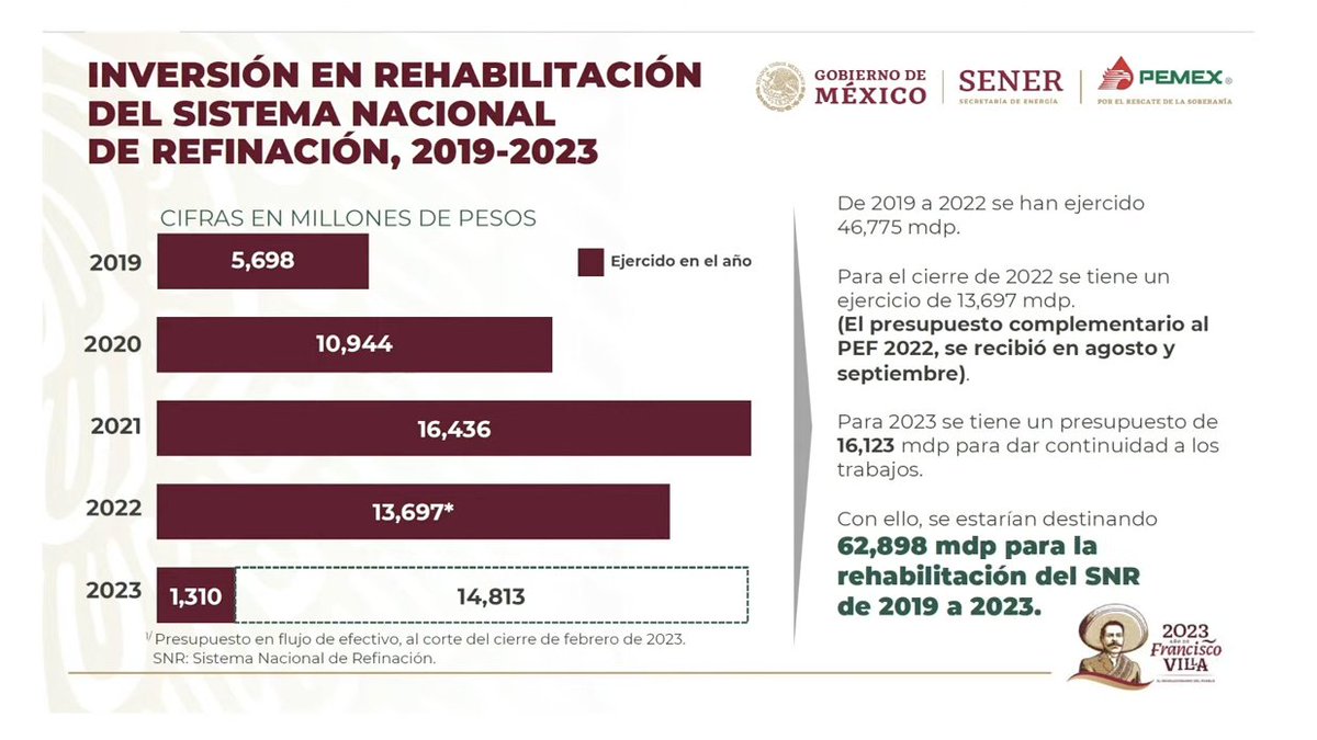 #ConferenciaPresidente | @rocionahle dijo que de 2019 a 2022 se invirtieron 62,898 mdp en la rehabilitación de 6 refinerías, además, adelantó que en 2023 se destinarán 16,123 mdp para continuar los trabajos de rehabilitación en esas refinerías.