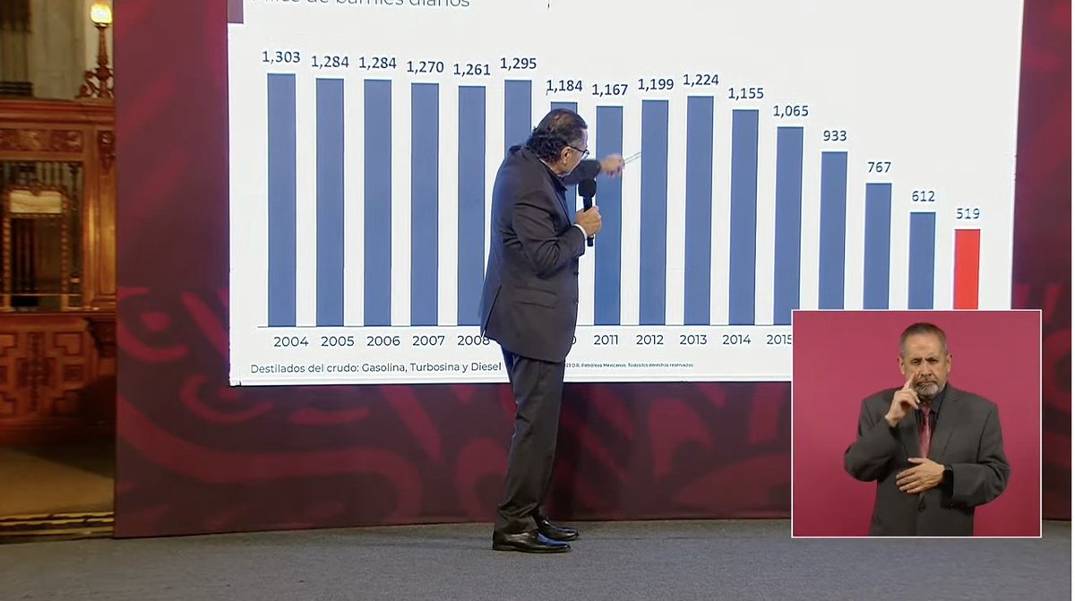 #ConferenciaPresidente | Octavio Romero Oropeza, director de @Pemex, explicó que a partir del 2005 la producción de petróleo crudo comenzó a descender y en 2016 ésta se desplomó.