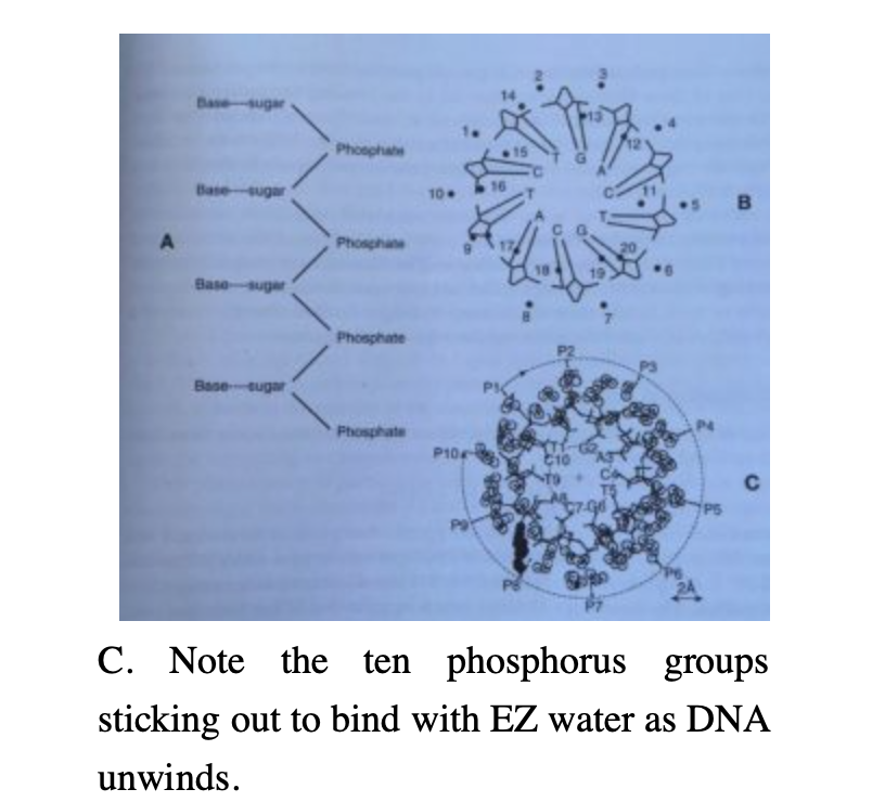 29. On the outside of DNA sits ten phosphate groups that interact with 447 water molecules. These water molecules encapsulate the phosphate groups and form hydrogen-bonded antennae or filaments.