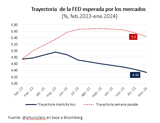 En resumen: puede q otros bancos caigan, pero probabilidad de crisis sistémica como la subprime aún es baja --> inflación no va a caer por si sola, sigue alta y mercado laboral fuerte --> la FED va a tener que seguir subiendo la tasa y mercados aún no lo asumen.