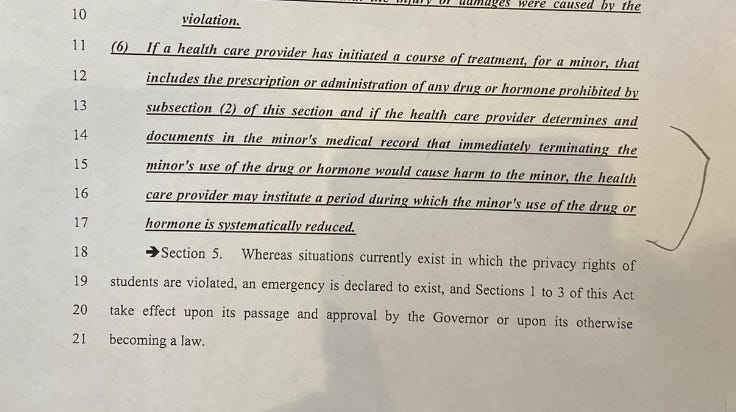 One provision in the bill - we literally only have paper phone camera photos for the bill - tells doctors they are to "systematically reduce hormones" for the trans youth under their care.