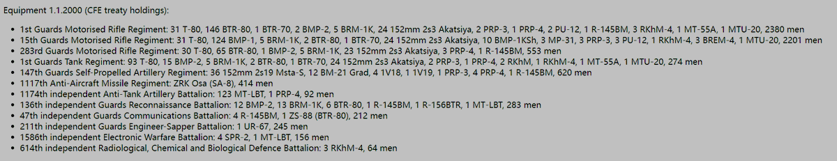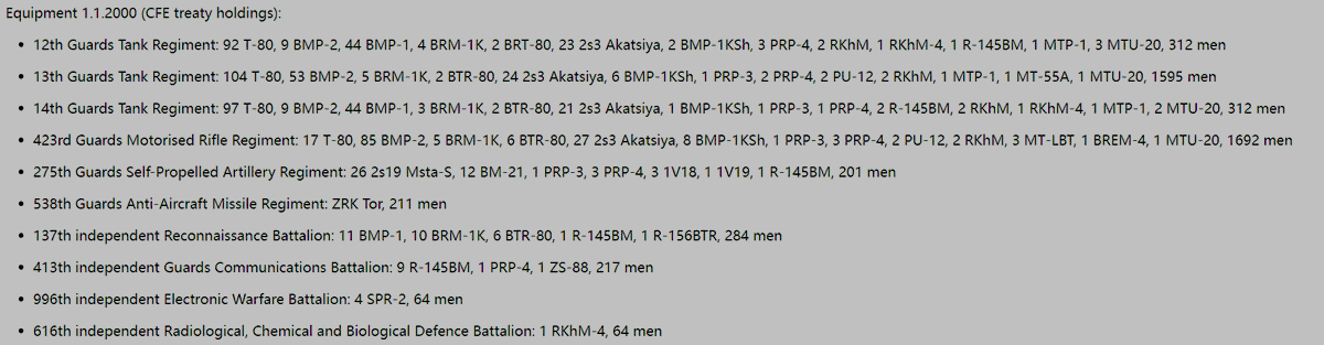 With the 423rd Guards Motor Rifle Regiment reequipped with T-80BVs from unknown time period, the 4th GTD participated in the war with two regiments (12&13th GTR) of some 189 T-80U tanks (of which 4 BTG worth of 126 tanks were committed in the first period).