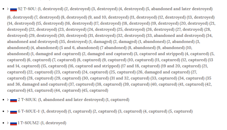 A T-80U thread. Russia inherited 600~700 T-80Us from the Soviet Army in 1991. According to SIPRI some 125 were exported to Cyprus and South Korea (among which 74 were exported before 2000). No recorded battle losses before Feb 2022.