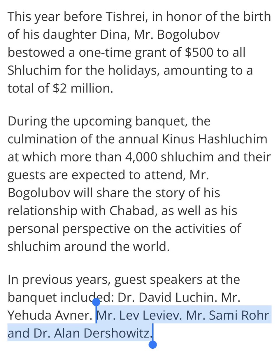 “Philanthropist Gennady (Zvi Hirsch) Bogolubov, one of the biggest supporters of Chabad shluchim worldwide, will be the guest speaker at the banquet of the Kinus Hashluchim.”