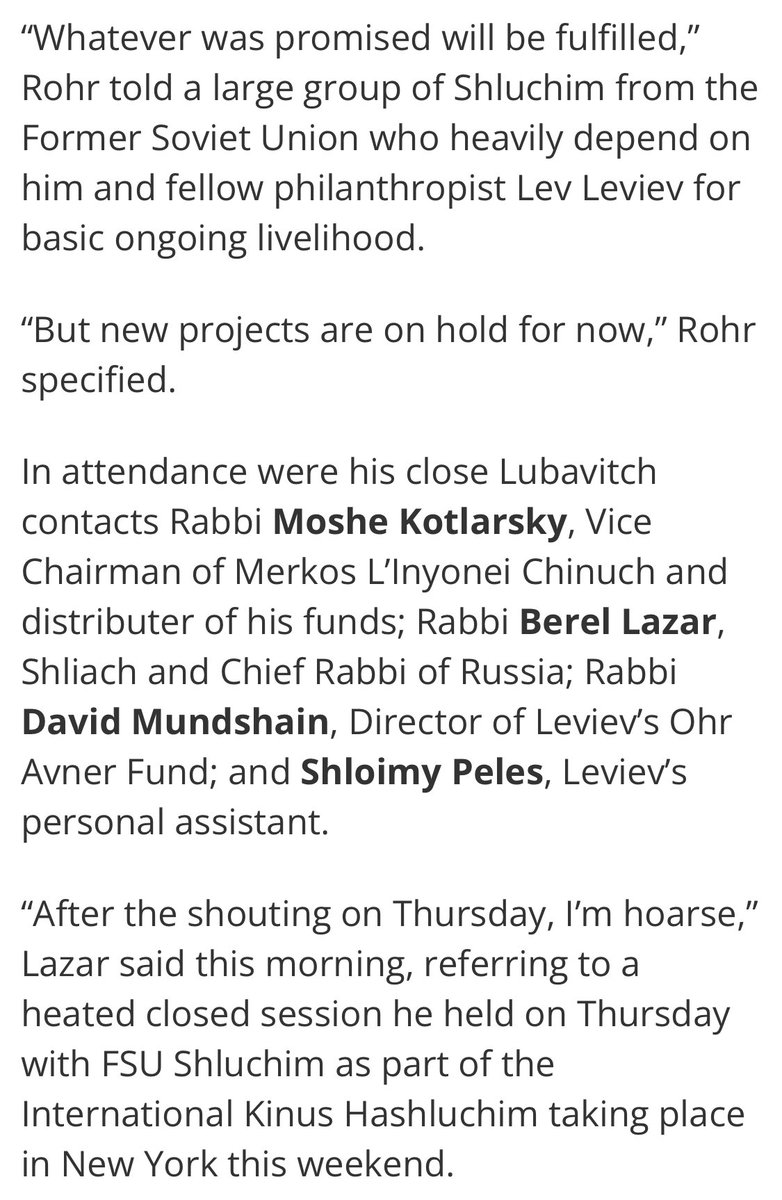 “Rabbi Moshe Kotlarsky said he sees the economic recession as a “test.” He pointed to the continued dedication, despite real limitations in the current economy, of pillars like Lev Leviev, George Rohr, and Gennady Bogolubov.”